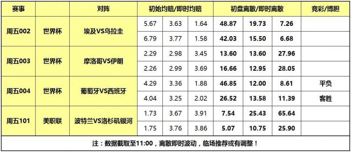 [关于离散] 是竞技彩票特有分析指数,指数基于百家欧赔即时赔率分歧度。基本原理是:百家欧赔平均值与每家赔率差值的绝对值的求和。离散度小则赔率公司观点接近,进而 彩果易打出,离散度大则反之意见分歧大,彩果不易打出。又因庄家操盘/变赔影响,离散低则概率高理论并非放之四海而皆准,需结合盘赔和基本面等信息综合运 用。简言之,离散是参考指标,而非填单依据!以下是各场数据汇总(数据截取至11:00):
