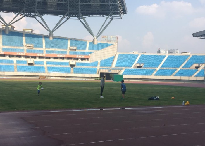 走进场地,我发现自己竟不是孤独一人——仿佛就是为了映衬我此行的目的,在我眼前呈现了这样一幅情景:一位岁数不大的足球教练,正带着两个小朋友练高空停球。