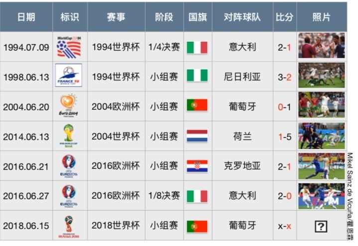 自从西班牙在1994年世界杯小组赛阶段3-1击败玻利维亚之后,他们在重大赛事中身着白色球衣的比赛无一例外地遭遇了失利。而那一届世界杯中的他们便是在四分之一决赛中身着白衣被意大利队淘汰出局。