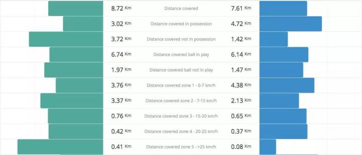 接下来是跑动情况,跑动距离,C罗8.72公里对梅西的7.61公里,相差1公里多,而相差更多的是无球跑动距离,C罗达到3.72公里,而梅西只有1.42公里。