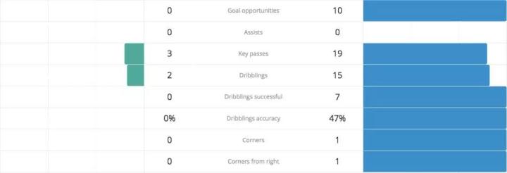 关键传球方面,梅西占到了19对3的压倒性,带球次数更是15:2的对比,有传有带就是不进球,为之奈何?
