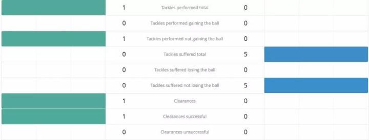 看看防守数据,C罗终于可以扬眉吐气了,虽然铲球和解围分别只有1次,但梅西在这两项数据中都吃到了零蛋。被铲球方面,梅西遭受了5次,但一次都没有丢球。