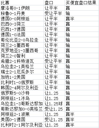 再看看让平半(或让1.25球等等)的下盘,这种盘口在上届世界杯和本届世界杯(头8场)一共出现了23次,其中10次全赢,4次赢半,输盘有9次,如果全部都买下盘的话,会有300元的盈利,其中让1.25球的下盘十分夸张,7场这样的比赛,只有俄罗斯5-0大胜沙特是输盘,其他6场全部可以盈利,如果7场全买,会有350元的收入。不过如果只看本届世界杯,盈利情况就不乐观了——伊朗1-0击败摩洛哥全赢,但丹麦1-0战胜秘鲁把所得盈利全部抵掉。在1.25球盘口方面,阿根廷1-1战平冰岛可以赢回俄罗斯大胜沙特的损失。