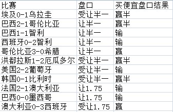我们先看看让半一(或让1.75球)的上盘的情况,在上届世界杯和本届世界杯(头8场)一共出现了11场这样的盘口,其中全赢的只有2场,4场赢半,输盘场数多达5场,因此虽然赢盘场数比输盘场数多一场,但由于“赢一半”(例如,A队让半一盘口,最终A队1-0战胜B队,此时投注上盘只能盈利投资本金的50%)的存在,假设全部比赛的上下盘水位都是1.00,每场投入100元(这样设定为了方便计划盈利,下面全部比赛都是这种设定的购买模式),那么这11场全部买上盘的话,最终的结果是亏损100元,看来这种便宜的盘口并没有想象中的优势。