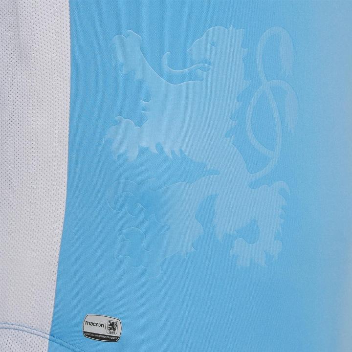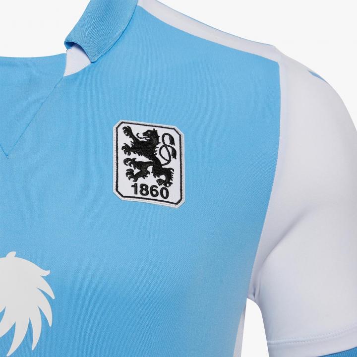 全新慕尼黑1860主场球衣延续球队经典的天蓝色外观,拥有白色衣袖以及条纹装饰的天蓝色主场战袍让人不禁想起球队曾经身着天蓝/白色剑条衫的时光。一个设计独特的圆领让新战袍看起来相当特别,背后衣领下方依旧加入“Einmal Löwe,immer Löwe”(一日为狮,终身为狮)的口号。