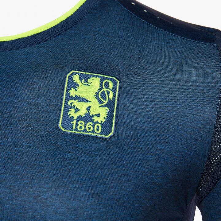 慕尼黑1860新赛季客场球衣则拥有一个别致、低调的海军蓝色外观,球衣的Macron Logo、队徽以及胸前广告都以醒目的荧光黄色呈现,让其更显引人注目。与主场球衣相同,客场球衣背后衣领上同样加入那句令所有慕尼黑1860球迷激动不已的口号——“Einmal Löwe,immer Löwe”(一日为狮,终身为狮)。