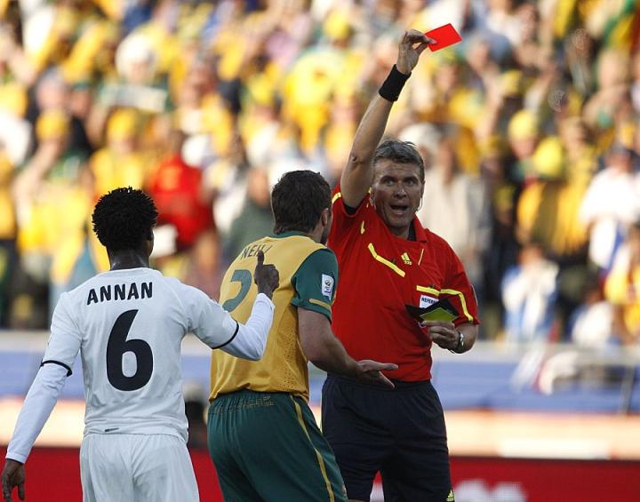 小组赛第二轮,首回合0-4输球的澳大利亚面对非洲球队加纳。比赛进行到24分钟时,加纳球员乔纳森·门萨的射门打到了补防到门前的科威尔的手臂,当值意大利主裁罗塞蒂送上了红点套餐——判罚点球的同时将科威尔罚出场外。吉安的点球将比分扳成1-1平,这个比分也是最后的终场比分。