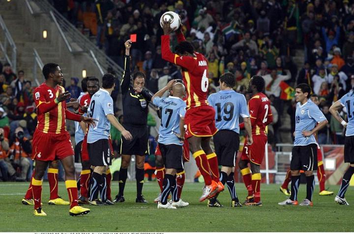 加时赛,场面依然十分焦灼,两队互有来回直到最后一分钟。最后一分钟,加纳在前场获得任意球,安南的罚球在乌拉圭禁区制造了混乱。乱战中站在门线上的苏亚雷斯用膝盖挡出阿皮亚的第一次射门,阿迪亚头球再射,富西莱和苏亚雷斯一起封堵,苏亚雷斯用双手将球拍出。这次如门将一般标准的扑救动作没有逃过主裁眼睛,苏亚雷斯被红牌罚出场外,并给加纳队一个点球机会。