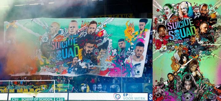 这张Tifo的创意来自于DC漫画改编的电影自杀小队(Suicide Squad)的海报。海报上的小丑、小丑女、死射等漫画形象,都变成了海牙队中球员的画像。他们想要向这些在场上拼搏的球员们致敬:最坏的英雄,但却是最重要的,我们的英雄!