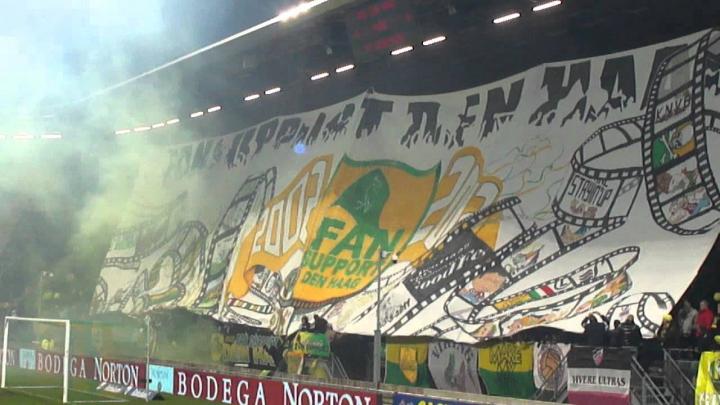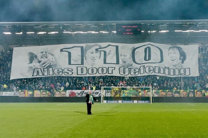 提到球场内的巨型Tifo,可能大家第一个想到的就是多特蒙德的威斯特法伦球场,大黄蜂的球迷氛围一直是他的球迷们最引以为傲的。但如果你愿意花时间去了解一下海牙球迷们制作的Tifo,你一定会对他们印象深刻。