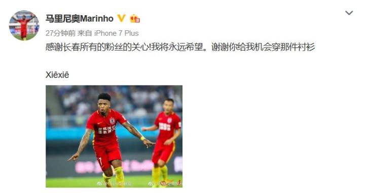 马里尼奥在微博中写道:感谢长春所有的粉丝的关心!我将永远保持希望。谢谢你给我机会穿那件衬衫,谢谢!