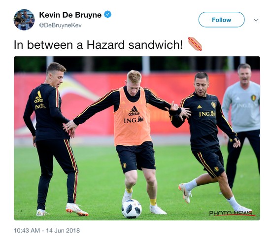 (图)德布劳内调侃自己被阿扎尔兄弟包夹