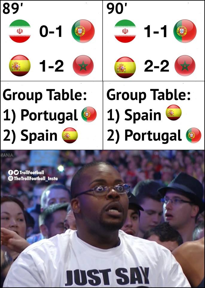 戏多!本赛季英冠末轮的不胜剧本再次上演(卡迪夫城0-0与富勒姆1-3同时不胜),B组两支理论上必须都赢球的球队齐刷刷同时不赢球,葡萄牙1-1伊朗,西班牙2-2摩洛哥,各取1分,排名不变,双牙依然携手出线。而且过程中还穿插了点球+点球不进+绝杀+再绝杀等剧本,1分钟之内逆转乾坤,让人目瞪狗呆,大呼过瘾。