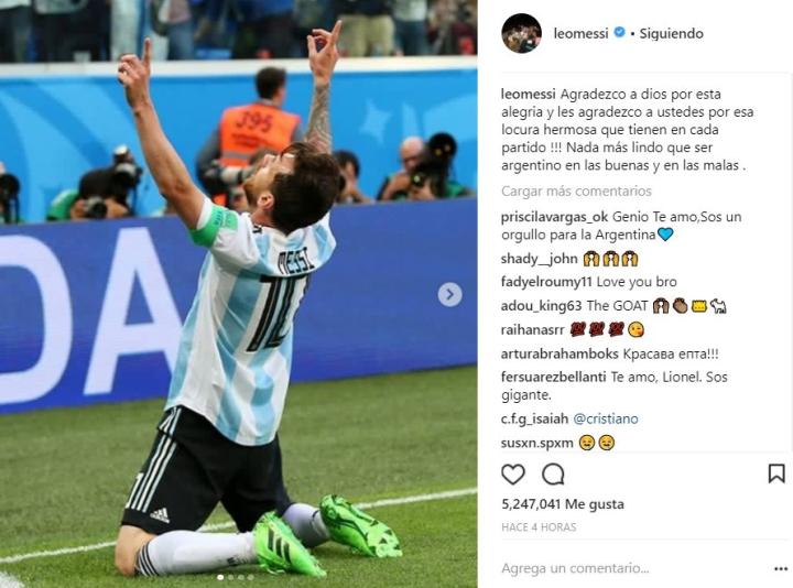 赛后,梅西在社交媒体上感谢了球迷的支持:“感谢上帝带来了这份欢乐,感谢你们在每场比赛的疯狂。不管顺境逆境,没有什么比身为阿根廷人更为美妙的事情。”
