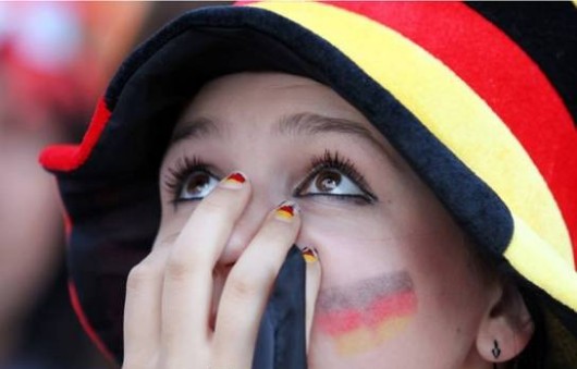 足球汉堡、足球椰子、足球可乐,满大街插满国旗的私家车。在德国国内,广场上有成千上万的目光紧锁大屏幕,而渴望胜利的德国球迷此前是多么希望从东方赛场听到好消息。不过,如今的他们不得不再等四年,等回那个充满铁血精神的德国战车。
