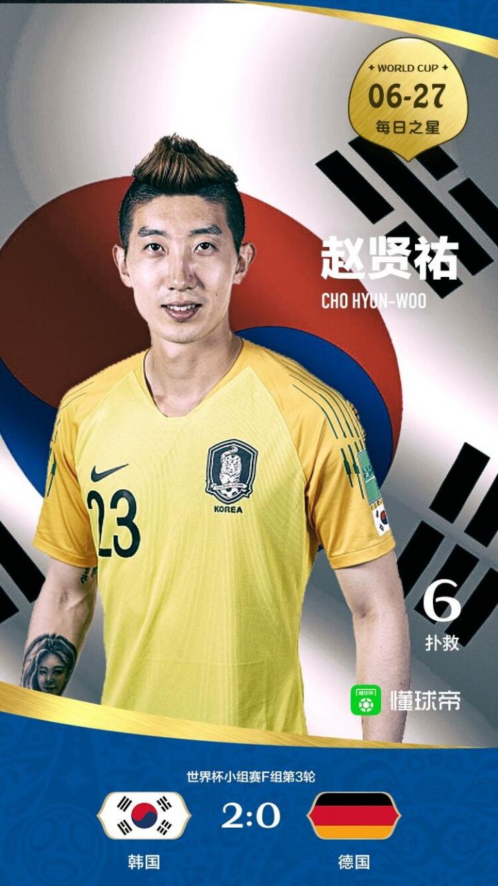在本场比赛中,效力于韩国大邱FC的赵贤祐高接低挡,面对德国队全场24脚射门6脚射正,他多次做出关键扑救力保韩国队球门不失,6次拒绝了德国战车的炮弹,实力当选了懂球帝世界杯今日之星。