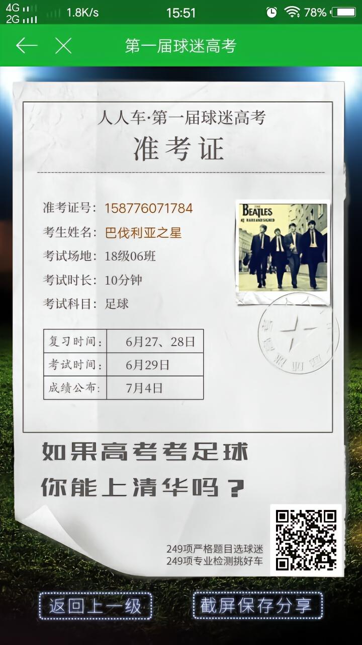6月29日,人人车“第一届球迷高考”就将正式开考,由“我的护球像亨利”的李毅大帝担任监考官,答题得分最高的“真球迷状元”将获得一张免费的俄罗斯世界杯决赛门票,只要你热爱足球,只要你了解足球,就有机会亲临现场见证王者登顶。点击链接开始通往你的世界杯决赛之路吧!