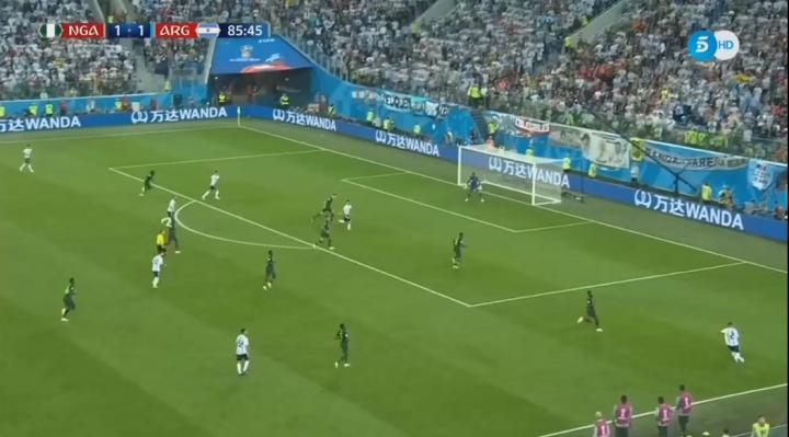 这个球很清晰地体现了前文所述的在阿根廷的推进和守转攻中巴内加,伊瓜因和迪马利亚作用,随后梅西主罚的任意球险些扩大比分。