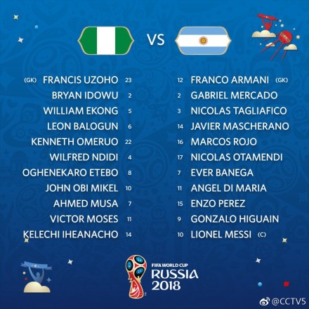 对阵尼日利亚的首发又回到了四后卫的阵型,但相比第一场做出了几个比较显著的人员变换,一是脚下技术和控节奏能力最强的巴内加进入了首发阵容,恩佐佩雷斯站右中前卫,迪玛利亚回归首发,出任左边锋,有身高和反击中支点能力的伊瓜因取了代阿奎罗。后卫线上的四人相比首场比赛,唯一的人员变化是梅尔卡多替换了萨尔维奥。