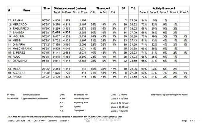 这一场阿根廷整体的积极性和求胜欲望终于达到了世界杯的要求,全队的跑动量拼到了最后,梅西则比前两场都多跑了1公里有余。