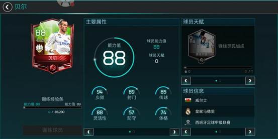 右边锋与左边锋是同样的道理,属性越高越好,推荐玩家使用贝尔这名球员。贝尔的属性主要集中在速度和射门上,完美的契合了4-3-3阵容需要边锋来发起进攻的特点。