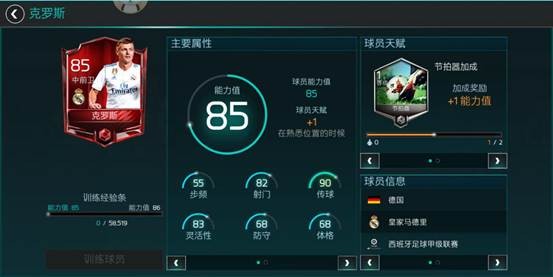 由于4-3-3阵型的进攻核心就是中前卫,所以同样推荐使用高属性球员,克罗斯作为万能球员可以完美兼容各个阵型。这名球员的传球属性高,可以轻松传球给主要进攻的左右边锋,并且也有非常不错的射门能力,可以在边锋回传后进行打门。
