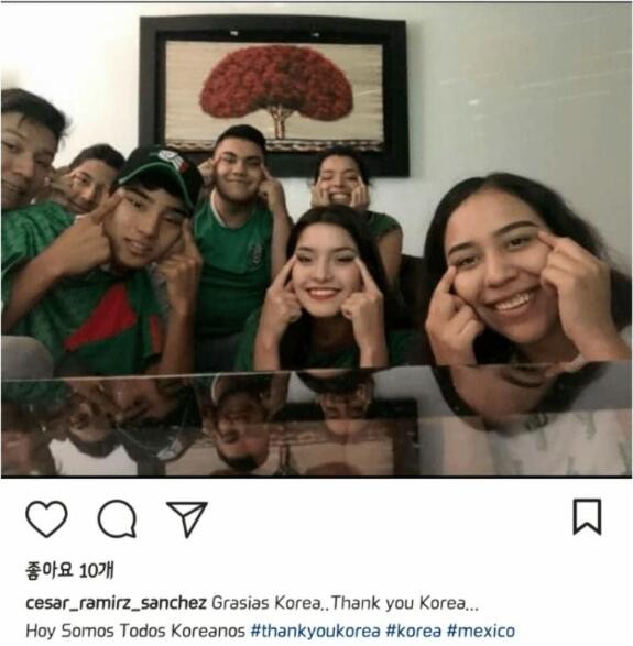 不过,墨西哥百姓们貌似并没有这么多顾虑,他们在社交平台上创建了“感谢韩国”的话题,并晒出了拉眼角示好的照片。从中也可得知,在墨西哥所处的拉美文化中,他们或许更认为这一动作是善意之举,而非歧视之意。