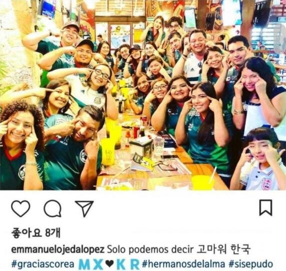 在韩国队成功阻击德国队让墨西哥队死里逃生晋级世界杯十六强后,墨西哥球迷对于韩国队的感谢一直在持续。他们甚至在社交平台上发起了“感谢韩国(grasiaskorea)”的话题,并做出“拉眼角”的动作,以表达感恩之意。