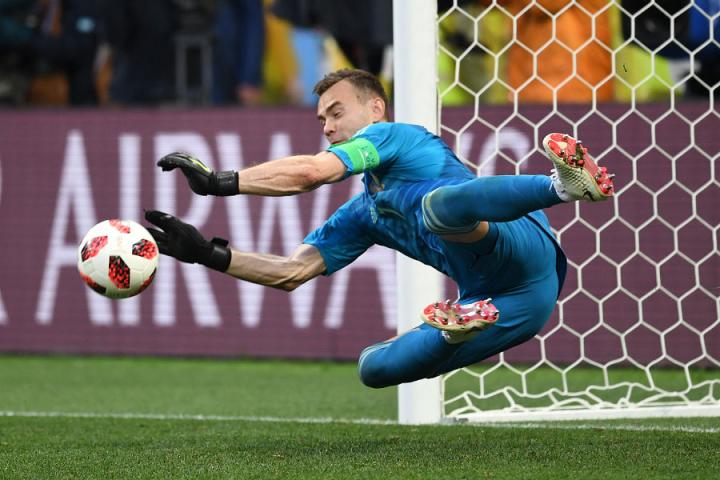 尽管身为东道主,但青黄不接的阵容让人们很难看好俄罗斯队的前景。在中前场有一力降十会的久巴和戈洛温等年轻球员的冲击力,或许能够保证进攻火力,但在防守方面,仅仅凭着“更高、更快、更强”无法解决问题,想要在世界杯舞台上生存下去,还要有足够的经验来应对对手的强大攻势。所以,切尔切索夫把当年的俄罗斯“青铜一代”球员伊格纳舍维奇、日尔科夫、阿金费耶夫等都带到了世界杯赛场上,这些老将也没有辜负主帅的期望,和其他队友们一起为俄罗斯创造历史。本场比赛,阿金费耶夫全场共做出9次扑救,没有让西班牙队将优势转化为胜势,点球大战中又2次将西班牙队的点球拒之门外,是俄罗斯队晋级8强的最大功臣。