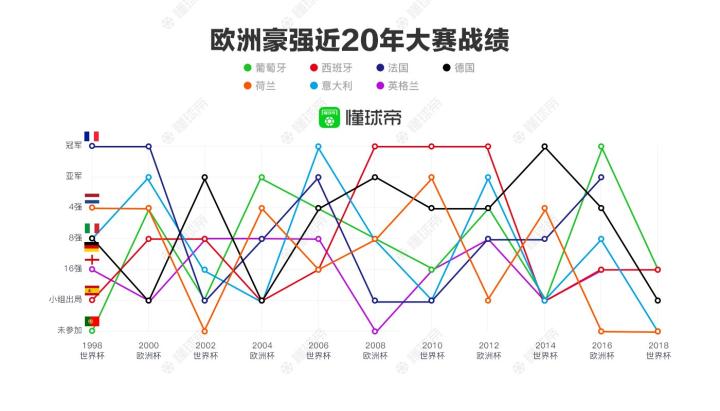 懂球帝海报:近20年来,欧美豪强的大赛战绩都是怎样的?胖球 @懂球帝2018-07-02 15:35今天凌晨,传统豪强西班牙队告别了世界杯的舞台。本届世界杯中,先是荷兰队和意大利队折戟预选赛,之后德国队小组赛出局,淘汰赛刚开始,阿根廷队,葡萄牙队又先后打道回府。以20年为界,这些传统豪强的大赛战绩都是怎样的呢?展开更多