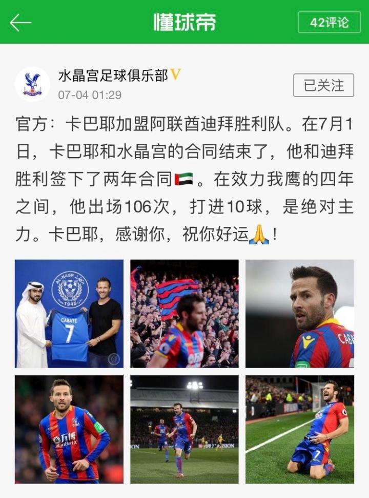 卡巴耶告别水晶宫球迷:“我们还在英超,因为有大家的支持”水晶宫足球俱乐部 @懂球帝2018-07-04 18:35在加盟阿联酋迪拜胜利之后,卡巴耶向水晶宫球迷道别:“感谢水晶宫大家庭,从第一天开始你们就对我很好?我永远不会忘记在塞尔赫斯特的日子,非常感谢球迷们?我们还在英超,因为有你们的支持!多谢,我会想念你们的,祝大家新赛季一切都好❤️”感谢你,卡巴耶?!展开更多