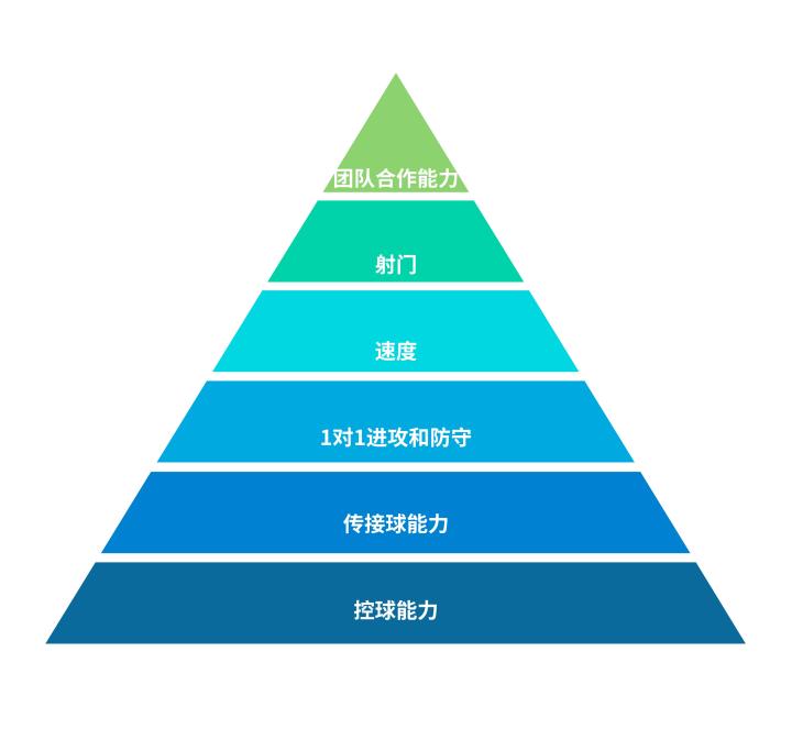 如下图所示的金字塔中,从下往上依次是:控球能力、传接球能力、1对1进攻和防守、速度、射门和团队合作能力。这是青训阶段足球少年们需要不断攀登的“阶梯”,只有掌握了全部技能的孩子,才有资格站在这个年龄段的金字塔尖。