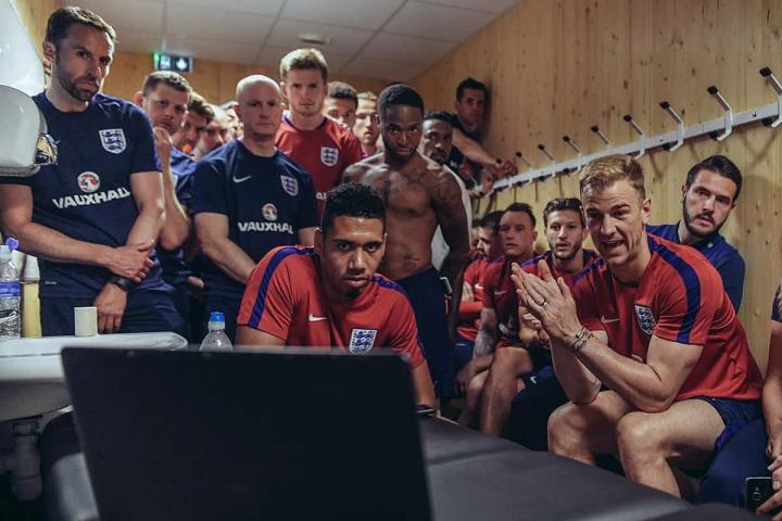 里甘也曾拍过一张英格兰全队在更衣室观看比赛的照片。那是2017年,英格兰队的球员们在训练课结束之后聚在一起看英格兰U20与委内瑞拉的比赛。