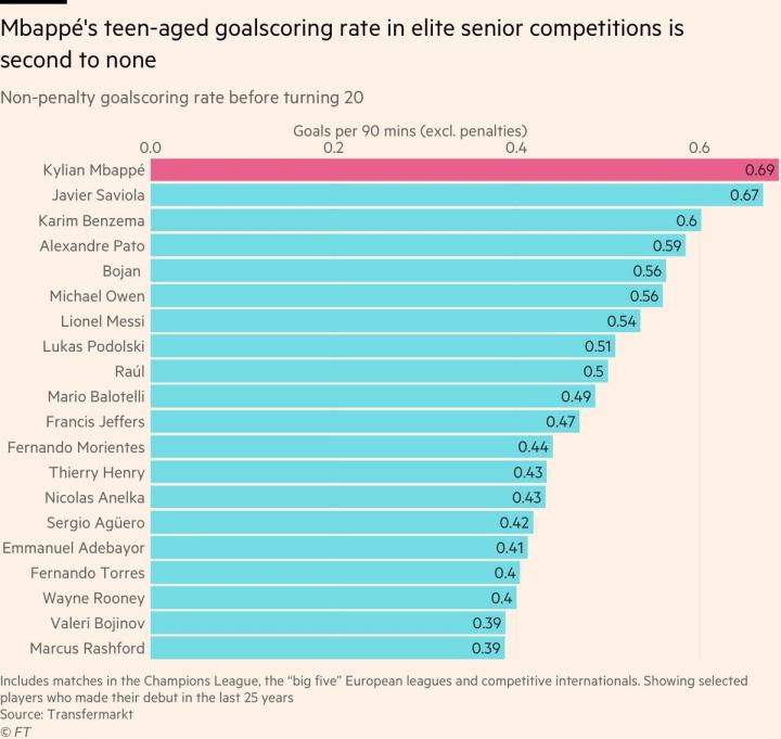 (20岁以下球员精英赛事进球率姆巴佩高居榜首)