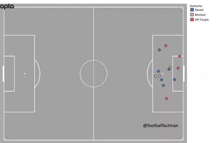 (贝里在禁区18码内的射门失败次数已经有一打了)
