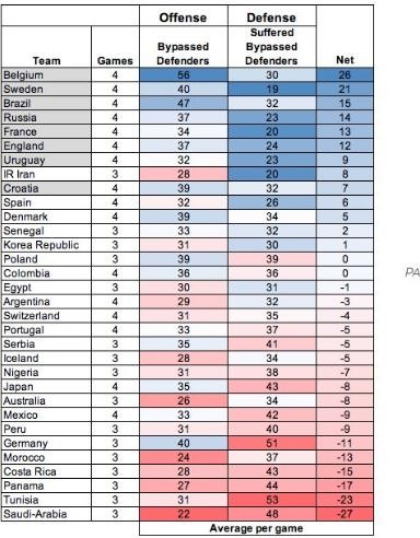 根据保罗-莱利的数据,在所有世界杯参赛球员中,贝里的预期进球数(2.69)位居前五位,但是他仍然没有取得哪怕一粒进球。当然,瑞典能位列八强是因为他们的防守,主帅安德森打造的这支球队会死死地与对手纠缠。统计公司数据显示,瑞典的防守球员(场上最后五名防守球员)是世界被上所有球队中最难被绕开的(通过传球成功或盘带过人的方式),他们可是比大多数的球队多踢了一场比赛!