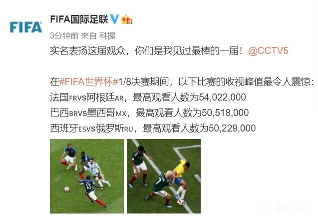 国际足联写到:“实名表扬这届观众,你们是我见过最棒的一届!在#FIFA世界杯#1/8决赛期间,以下比赛的收视峰值最令人震惊:法国vs阿根廷,最高观看人数为54,022,000;巴西vs墨西哥,最高观看人数为50,518,000;西班牙vs俄罗斯,最高观看人数为50,229,000。”