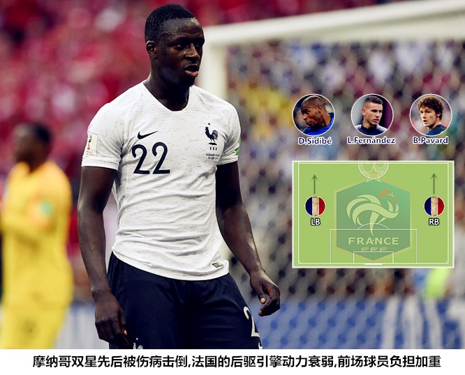 三是伤病的影响不容低估。早在两年前的本土欧洲杯上,法国就是阵容深度最好的球队之一,两闸是他们为数不多的短板。在埃弗拉和萨尼亚淡出之后,摩纳哥双星本杰明-门迪和西迪贝的崛起,一度让高卢雄鸡拥有了无比强势后驱动力。令人遗憾的是,门迪在转会英超后遭遇重伤,西迪贝在上赛季后期也不幸被伤病击倒,这位性格倔强的右后卫采用保守治疗的方式与时间赛跑,无奈由于匆匆复出后在六月初的热身赛中表现不佳,西迪贝最终“在震惊和痛苦中”被新星帕瓦尔取代。