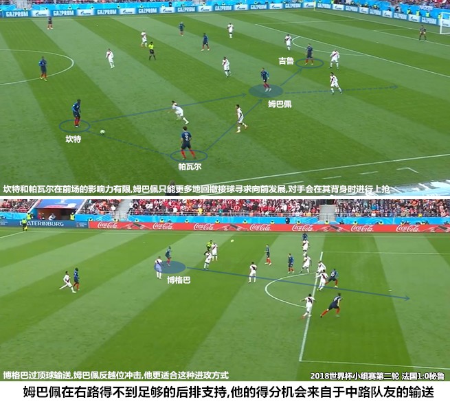 (姆巴佩在对阵秘鲁时的进球来自于左路的攻势,大巴黎天才承担的是无球任务。)