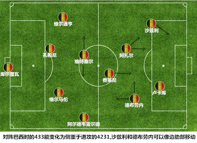 在这场比赛中,比利时的两个进球分别是对手的乌龙送礼和己方的远射,预期中的高空轰炸并没有出现,身高1米87的沙兹利和身高1米94的费莱尼甚至没有在禁区内完成触球,他们的任务就是为伪九号德布劳内保驾护航。半决赛对阵法国,德布劳内的前进道路上会出现最强防守者坎特,马丁内斯必须鼓励中场球员在卢卡库拉边时积极投身到进攻中。如果卢卡库在右路能够同时牵制卢卡斯-埃尔南德斯和马图伊迪,法国禁区弧顶区域必然空虚,德布劳内可以像迪马利亚一样远射扣关,也可以利用直传将沙兹利和费莱尼送入射程。