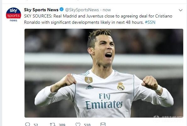 此前,关于C罗加盟尤文的消息甚嚣尘上。意大利天空体育转会专家迪马济奥也在个人网站表示,这段时间可能是暴风雨前难得的平静,C罗转会尤文图斯一事,下周(北京时间本周)会是决定性的。