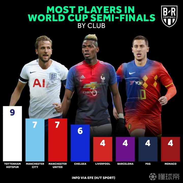 有意思的是,这五支球队也分别在四强中的三支球队有本队的球员,也就是说这五家俱乐部目前都有75%的概率能有自家球员问鼎世界冠军。(吐槽:如果利物浦能在世界杯前签下费基尔的话那就是唯一的一家100%了......)
