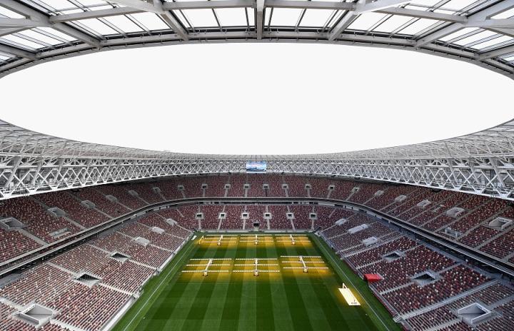 卢日尼基体育场内景,开幕式及决赛用莫斯科主体育场选择混合系统。整个场地混合系统面层铺设,仅仅只用了4天时间,就建造完成一个达到世界杯标准的混合系统足球场,这已经创造了顶级足球场建造的时间之最