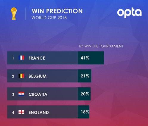 2、机构运算法——世界杯开赛前有不少大数据机构预测德国队夺冠概率最高,然后德国队被奶到小组赛出局。现在OPTA也来凑热闹,他们预言法国夺冠概率最高,法国人应该是二连慌。