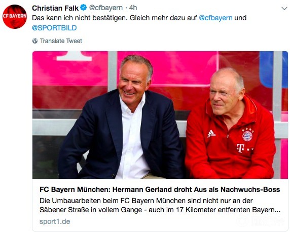 今天早些时候,德国媒体SPORT1爆料“老虎”赫尔曼-格兰德将不再担任拜仁青训营的主管,《体育图片》杂志足球主编克里斯蒂安-法尔克在推特上转发了这些新闻,表示此事并不存在。随后,法尔克联系到了格兰德,由“老虎”亲自进行辟谣。