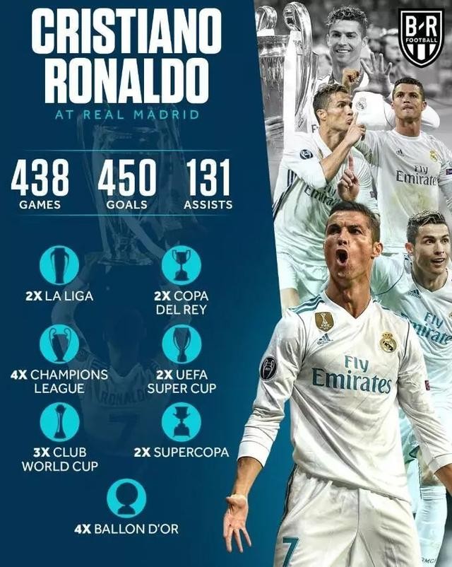 C罗在皇马效力期间一共踢了438场比赛,打入450粒进球。这一共帮助皇马赢得了2次西甲冠军、2次国王杯冠军、2次西班牙超级杯冠军、4次欧冠冠军、3次欧洲超级杯冠军,3次世俱杯冠军。