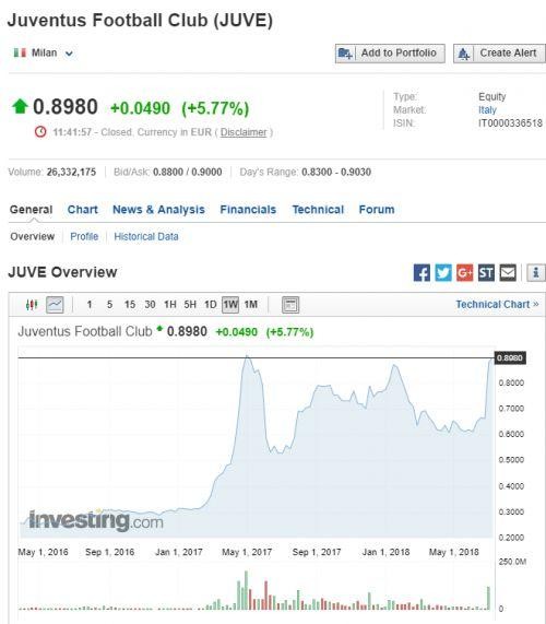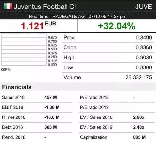 这是尤文图斯和C罗联系到一起之后,俱乐部股票飙升的幅度。甚至仅在传出C罗可能加盟消息后,尤文图斯俱乐部的股票在三天内就涨了32.04%,净值增加了1.121亿欧元。
