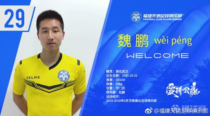 新援魏鹏,籍贯为湖北武汉,场上位置为守门员,曾于2015年至2018年6月效力于河南建业足球俱乐部。