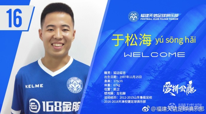 新援于松海,籍贯为延边延吉,场上位置为前卫,曾于2012年至2015年在山东鲁能足校学习,于2016年至2018年效力于天津权健足球俱乐部。