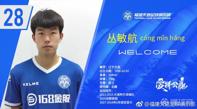 新援丛敏航,籍贯为辽宁大连,场上位置为前卫,曾于2011年至2015年效力于大连阿尔滨梯队,2016年效力于合肥桂冠足球俱乐部,2017年至2018年6月效力于保定容大足球俱乐部。